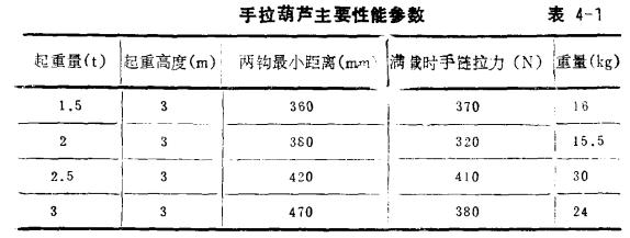 手拉葫蘆亦稱到倒鏈葫蘆,是一種最普遍的手動(dòng)提升工具。根據(jù)不同工程對(duì)象,手拉葫蘆可在12m起重高度范圍選擇合適長(zhǎng)度的環(huán)鏈。在爬升模板中常用的手拉葫蘆,其主要技術(shù)參數(shù)如表4-1所示。