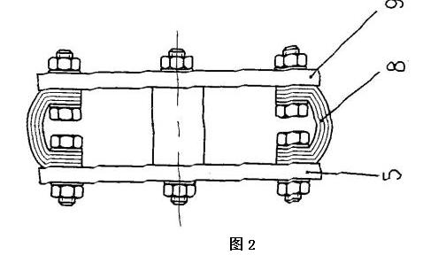 該電動葫蘆采用獨特的設計,利用手拉葫蘆和煤電鉆相結合,其手拉葫蘆的手拉轉輪上沒有纏繞搭接手拉鏈,煤電鉆包括機殼和卡裝在煤 電鉆的卡具上的鉆桿,手拉轉輪與鉆桿同軸設置,手拉轉輪朝外的端面朝向煤電鉆,殼體和機殼采用固定架固定相連,手拉轉輪朝外的端面上固定有手拉轉輪法蘭盤,手拉轉輪法蘭盤上均布有多個螺栓孔,每個螺栓孔處采用緊固件分別與一個皮帶條的一端固定相連,每個皮帶條的另一端通過鉆桿法蘭盤上的螺栓孔采用緊固件連接固定在鉆桿法蘭盤上,鉆桿法蘭盤上的螺栓孔位置與手拉轉輪法蘭盤上的螺栓孔位置對應,鉆桿法蘭盤安裝固定在鉆桿的端頭上。在使用時,當需要起吊重物時,可利用煤電鉆的電機帶動鉆桿按照需要的方向旋轉,鉆桿就會通過鉆桿法蘭盤、多個皮帶條8和手拉轉輪法蘭盤帶動手拉葫蘆的手拉轉輪按照需要的方向轉動,從而完成對重物的起吊。由于采用皮帶條這種軟連接設計將煤電鉆的電機產(chǎn)生的扭矩傳遞到手拉葫蘆的手拉轉輪,保證了手拉葫蘆轉動的平穩(wěn)性,再由于煤電鉆的輸出轉速較低,不需要另加減速裝置,故本發(fā)明的利用手拉葫蘆和煤電鉆改造成的電動葫蘆的結構非常緊湊,體積也較小,尤其適宜井下機電硐室起吊、裝卸設備和物件、以及安撤面使用,并可降低工人勞動強度,提高工作效率。