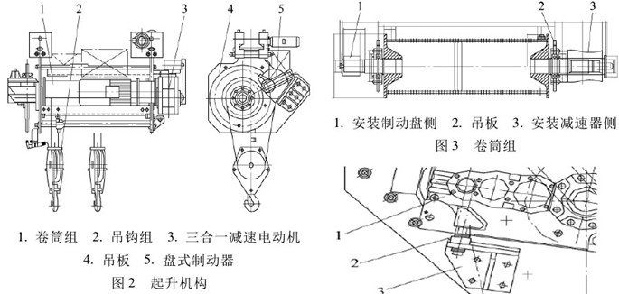起升機(jī)構(gòu)采用三合一減速電動機(jī),通過花鍵軸驅(qū)動卷筒組,卷筒組上設(shè)有電磁盤式安全制動器,用于保證在起升機(jī)構(gòu)故障時(shí)閘住卷筒,保證載荷不墜落。結(jié)構(gòu)上用2吊板將卷筒組吊掛起來,減速器力矩支撐、制動器、安全保護(hù)裝置等均安裝在吊板上。起升機(jī)構(gòu)見圖2。