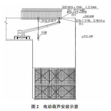 在抽水蓄能電站地下廠房土建及機電設(shè)備安裝施工過程中,因施工場地空間受限,導(dǎo)致材料垂直運輸通道單一影響現(xiàn)場施工進(jìn)度。為解決此類問題,利用電動葫蘆具有體積小、自重輕、操作簡單、使用方便等特點,采用在副廠房頂拱巖體位置安裝電動葫蘆、副廠房各樓層預(yù)留吊物孔的方式,形成副廠房臨時垂直運輸通道,滿足土建施工期模板、腳手架。機電設(shè)備安裝期空壓機氣罐、電氣盤柜等材料設(shè)備的轉(zhuǎn)運,有效利用現(xiàn)場施工空間。從而達(dá)到提升施工效率、降低現(xiàn)場施工強度及節(jié)約施工成本的目的。