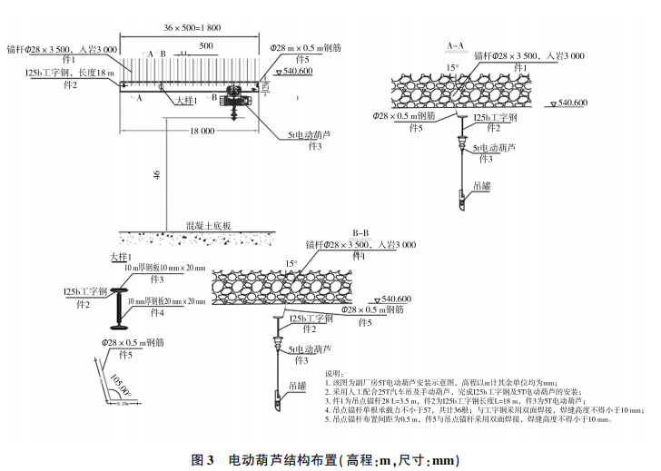 軌道安裝:電動葫蘆屬于特種設(shè)備,其組裝時應(yīng)以不得損傷任何零部件為原則,并應(yīng)嚴(yán)格按照設(shè)備技術(shù)文件規(guī)定及GB 50278-2010?起重機設(shè)備安裝工程施工及驗收規(guī)范?組織施工和驗收,電動葫蘆到達(dá)安裝地點后,首先應(yīng)先開箱檢查在運輸途中有無損壞情況.若發(fā)現(xiàn)有損壞情況,應(yīng)及時修復(fù)方可使用。清點設(shè)備技術(shù)文件,核查設(shè)備型號是否符合設(shè)計要求。并按施工方案進(jìn)行安全技術(shù)交底,為保證 5t電動葫蘆的使用安全,工字鋼施工安裝中應(yīng)注意以下事項:①125b工字鋼吊點錨桿必須嚴(yán)格按設(shè)計圖紙進(jìn)行施作。②吊點錨桿與125b工字鋼焊接采用雙面焊接。焊接長度不小于10d(d 為鋼筋直徑),焊縫高度,不小于10mm。③125b工字鋼吊點錨桿及軌道焊接施工完成后,需對錨桿進(jìn)行第三方無損檢測或者拉拔試驗并對軌道焊縫進(jìn)行探傷,檢驗結(jié)果合格后方可進(jìn)行下道工序施工。④電動葫蘆應(yīng)在安裝和即將安裝時開箱,以免因開箱過早、保管不善而發(fā)生質(zhì)量問題。⑤為防止電動葫蘆脫軌、在工字鋼軌道的兩端、相當(dāng)于專輪軸的高度,必須設(shè)置擋板。⑥電動葫蘆安裝完畢后應(yīng)進(jìn)行最后的機械、電氣的檢查。