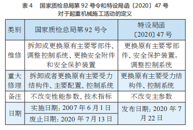 關(guān)于更換電動(dòng)葫蘆的施工定性,主要由《起重機(jī)械安全監(jiān)察規(guī)定》(國(guó)家質(zhì)檢總局第 92 號(hào)令)和之后發(fā)布實(shí)施的《市場(chǎng)監(jiān)管總局特設(shè)局關(guān)于明確起重機(jī)械有關(guān)名詞術(shù)語(yǔ)含義的通知》(特設(shè)局函〔2020〕47 號(hào))這兩個(gè)文件予以規(guī)定,具體定義詳見(jiàn)表 4,其中國(guó)家質(zhì)檢總局第 92 號(hào)令已廢止。根據(jù)上述文件的定義說(shuō)明,對(duì)于更換同規(guī)格電動(dòng)葫蘆的行為,根據(jù)國(guó)家質(zhì)檢總局第 92 號(hào)令屬于重大修理,根據(jù)特設(shè)局函〔2020〕47 號(hào)屬于一般修理。