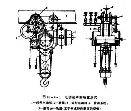 圖10-4-1所示,兩臺電動機各自驅(qū)動其起升機構(gòu),或運行機構(gòu)的鋼絲繩式的電動葫蘆其起升機構(gòu)由電動機、卷筒及其相應(yīng)的傳動系統(tǒng)所構(gòu)成,運行機構(gòu)則包括電動機,并通過傳動系統(tǒng)與驅(qū)動輪相連,電動葫蘆通常沿工字鋼下翼緣的踏面移動,當(dāng)然,在有些場合下,還可沿具有特殊斷面的軌道運行。