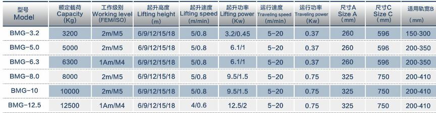 歐式鋼絲繩電動(dòng)葫蘆(單梁)參數(shù):